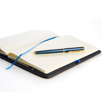 Each A5 hardback notebook/refill comes with matching elastic strip and pen holder (there is a slit for the pen holder on the leather cover), a ribbon bookmark and an additional pocket at the back with a brand logo embossed at the front in gold. Each has 80 sheets (160 sides) of lined paper. Refills are available to purchase separately in ten different colours to match the leather cover.