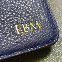 Letters are 8mm high (all capitals) and will be embossed in gold or blind (no colour) at the front right bottom corner. The maximum number of letters available, including spaces, numbers and special characters like dash, full stop and back slash, is eight.