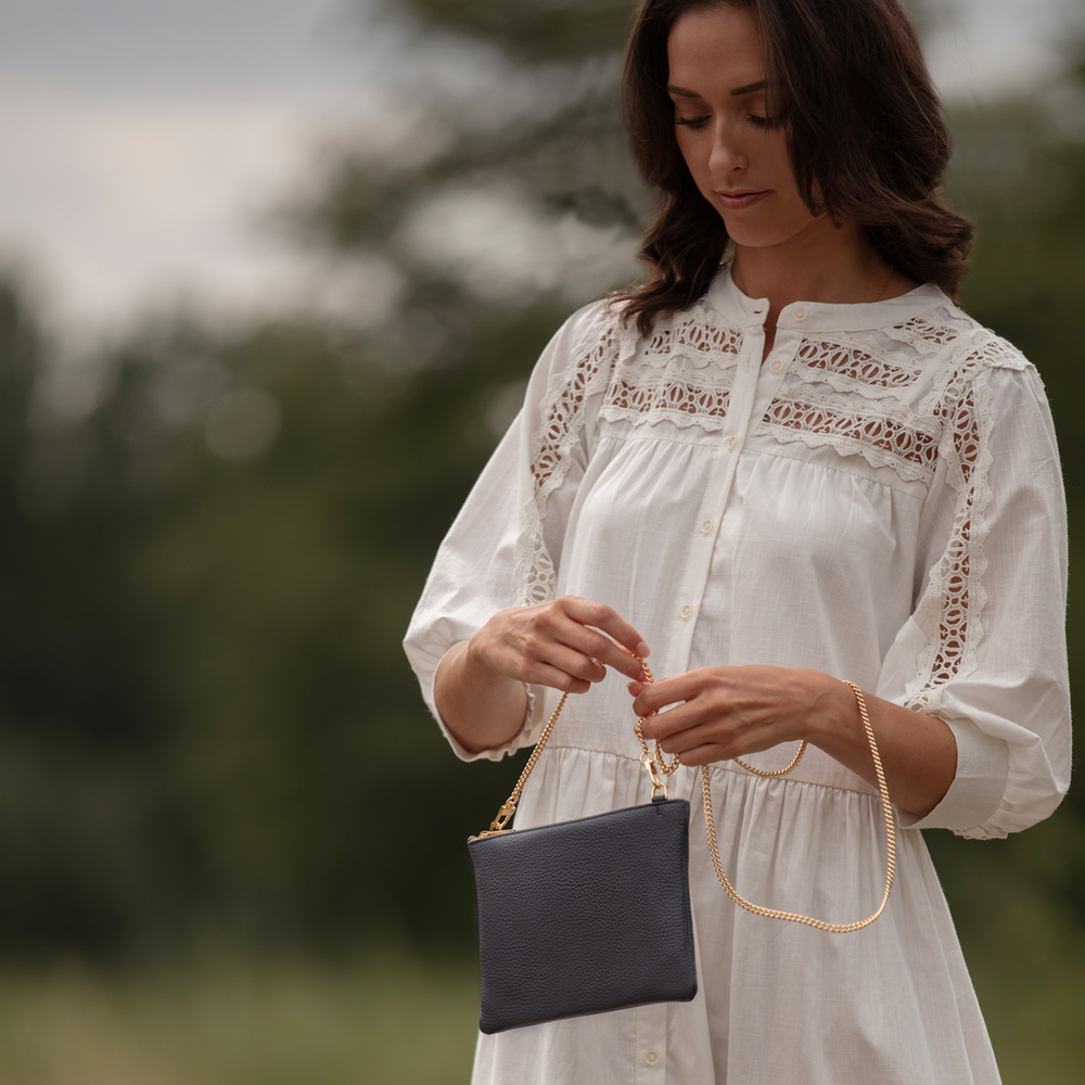 Thdesign is elevated with a polished gold-toned zip and a detachable gold chain strap that lends a refined, jewellery-like accent — perfect for evenings — while an optional adjustable leather crossbody bag strap transforms it into a more relaxed, everyday companion.