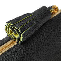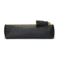 Chic and stylish personalised pencil case in textured black leather with matching double-coloured tassel in black and citron yellow, finished with a stitch.