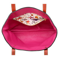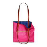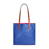 This royal blue and pink leather tote bag is spacious, slouchy, and easy to wear, making it the perfect everyday bag.  It can be easily turned inside out and worn with the alternative colour combination.  There is a zip pocket on the inside for holding your phone, keys, wallet, and other small essentials.  The pocket has a cotton fabric lining with a bold floral Liberty design and high-quality Italian gold-tone zip.  The brand logo is blind embossed at the front of the bag.