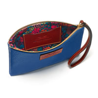Stylishly simple wristlet, handmade in royal blue textured, Italian leather that will never go out of fashion.  An attractive floral Liberty cotton lining and gold-toned metal zip add to this accessory’s understated elegance.  Incorporated inside the leather wristlet is a handy card pocket in brown cowhide leather.