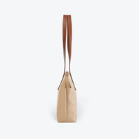 This simple yet stylish and versatile tote bag is handmade in London using soft Italian cowhide leather in cream for the main body and classic Northampton naturally tanned brown leather for the slim but sturdy and practical handles, which are long enough to comfortably fit over the shoulder on top of a coat.