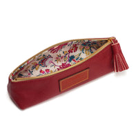 Our luxury pencil case is hand-crafted in Anya Sushko’s Kent atelier from luxury cowhide leather sourced from Italy.  The sophisticated burgundy exterior is offset by an elegant floral Liberty cotton lining and central gold-toned metal zip.  The brand logo appears on the front side of the burgundy pencil case on an elegantly embossed tanned leather stamp, which is finished with a yellow stitching detail.