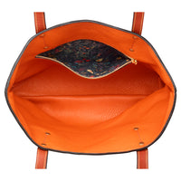 This tan and orange leather tote bag is spacious, slouchy, and easy to wear, making it the perfect everyday bag. It can be easily turned inside out and worn with the alternative colour combination. There is a zip pocket on the inside for holding your phone, keys, wallet, and other small essentials. The pocket has a cotton fabric lining with a bold floral Liberty design and high-quality Italian gold-tone zip. The brand logo is blind embossed at the front of the bag.