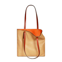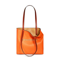 The Reversible Kent Leather Shopper Bag has quickly become our most popular product. This simple yet stylish and versatile bag is handmade using soft Italian cowhide leather in tan and orange for the main body and classic Northampton naturally tanned brown leather for the slim but sturdy and practical handles, which are long enough to comfortably fit over the shoulder on top of a coat.
