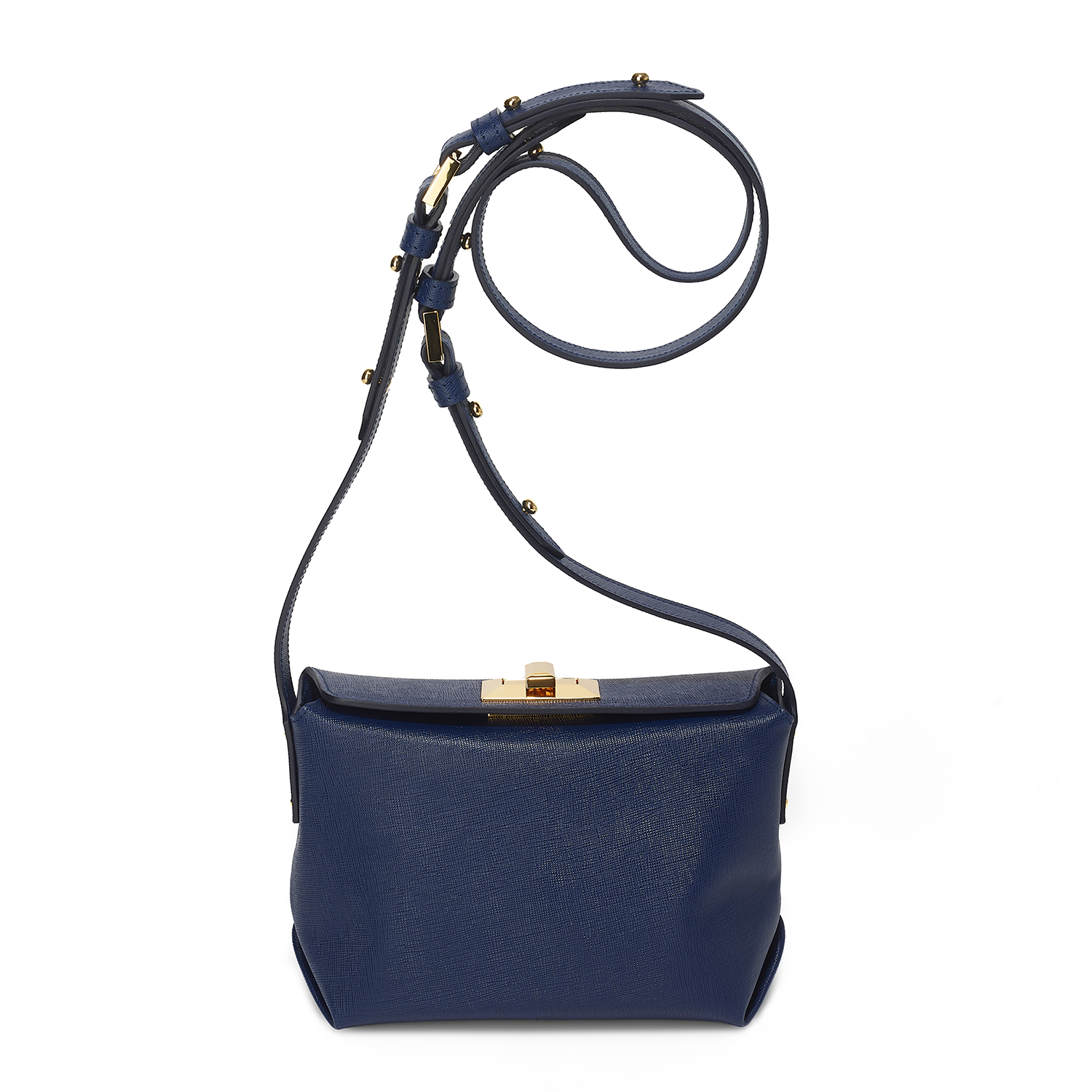 The minimalist design of the main body allows the sleek Saffiano Italian leather to take centre stage with the Art-Deco gold-tone lock providing a dazzling effect against the navy leather.