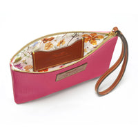 Stylishly simple wristlet, handmade in pink textured, Italian leather that will never go out of fashion. An attractive floral Liberty cotton lining and gold-toned metal zip add to this accessory’s understated elegance. Incorporated inside the leather wristlet is a handy card pocket in brown cowhide leather.