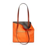 This grey and orange leather tote bag is spacious, slouchy, and easy to wear, making it the perfect everyday bag. It can be easily turned inside out and worn with the alternative colour combination. There is a zip pocket on the inside for holding your phone, keys, wallet, and other small essentials. The pocket has a cotton fabric lining with a bold floral Liberty design and high-quality Italian gold-tone zip. The brand logo is blind embossed at the front of the bag.