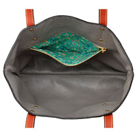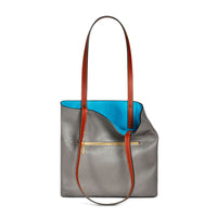 This turquoise and grey leather tote bag is spacious, slouchy, and easy to wear, making it the perfect everyday bag. It can be easily turned inside out and worn with the alternative colour combination. There is a zip pocket on the inside for holding your phone, keys, wallet, and other small essentials. The pocket has a cotton fabric lining with a bold floral Liberty design and high-quality Italian gold-tone zip. The brand logo is blind embossed at the front of the bag.