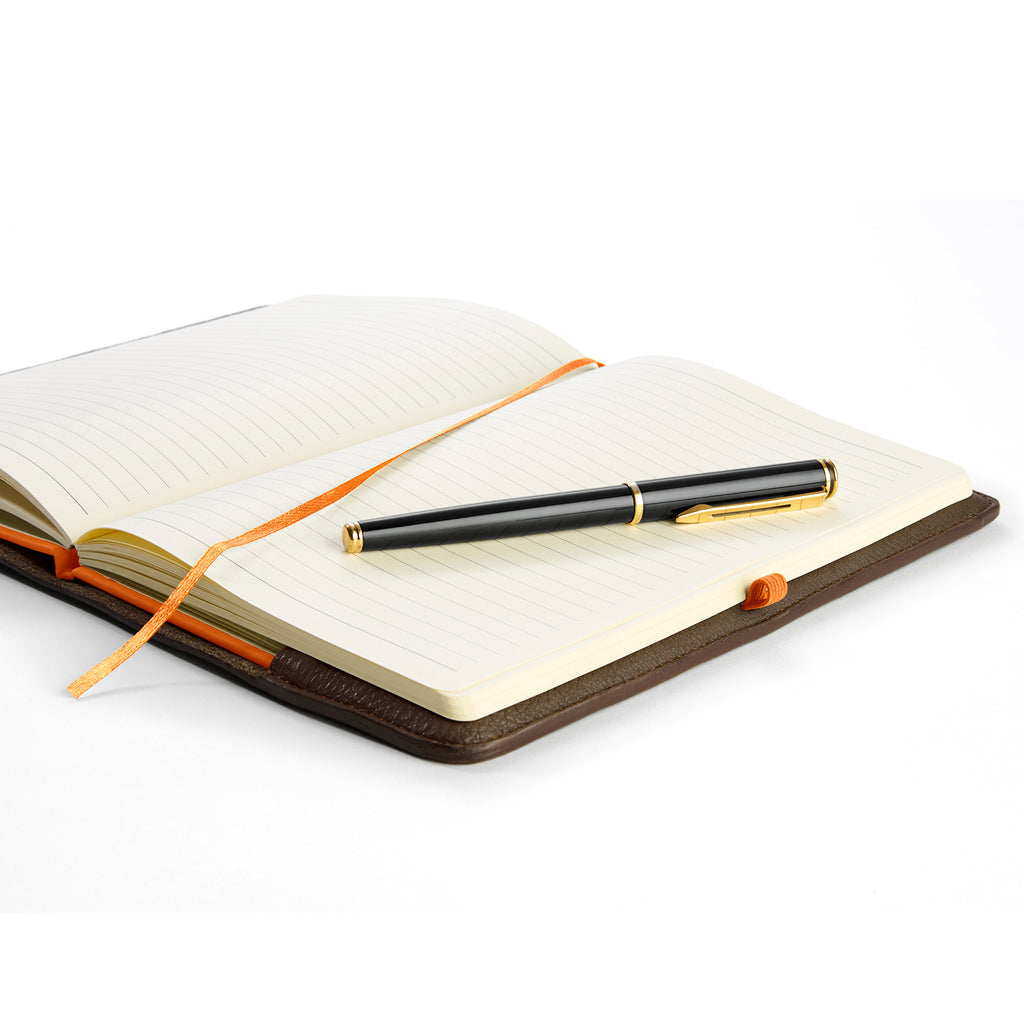 Each A5 hardback notebook/refill comes with matching elastic strip and pen holder (there is a slit for the pen holder on the leather cover), a ribbon bookmark and an additional pocket at the back with a brand logo embossed at the front in gold. Each has 80 sheets (160 sides) of lined paper. Refills are available to purchase separately in ten different colours to match the leather cover.